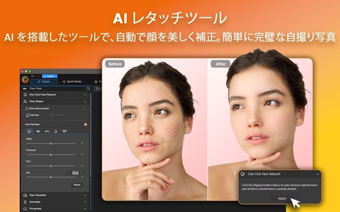 顔写真を選ぶと、レタッチや顔加工ができる画面に移動します。