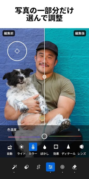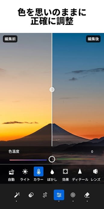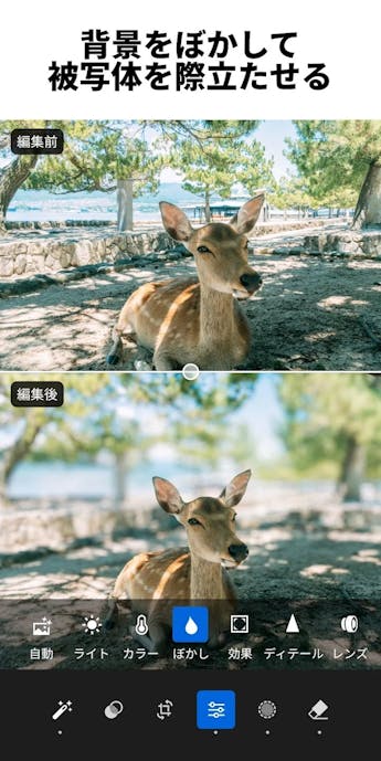ワンタップの自動補正でサッと仕上げることも、ガイド線や数値調整で細部まで追い込むことも可能。