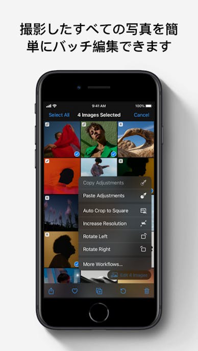 やり方は簡単で、「複数選択」から「一括編集」をタップして写真を2~9枚選択してから「次へ」をタップするだけ。
