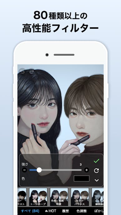 色味は25種類以上の効果や明るさ調整で整えられ、さらに露出やハイライト、シャドウを触ると、しっとり感が増します。