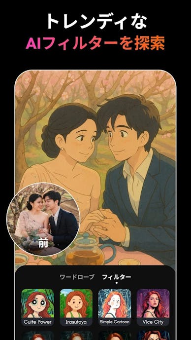 AIフィルターやアニメフィルターで、写真を一気にトレンド感のある仕上がりへ変換できます。