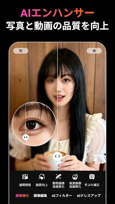 ぼやけた写真はAIフォトエンハンサーでくっきりさせられるから、写真が苦手な人も安心。