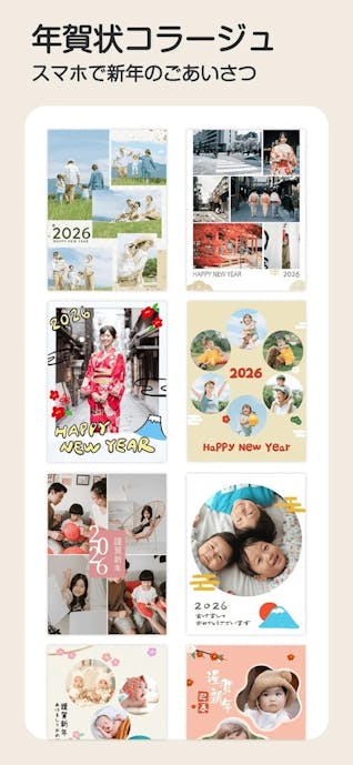 テンプレートやグリッドを選び、写真を指で動かすだけで完成する手軽さが魅力。