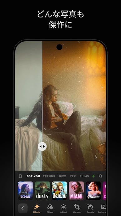 エモい系のフィルターやAI編集が得意! 流行りの加工をすぐ試せる無料の写真編集アプリ |