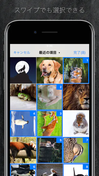 スワイプで複数枚を選び、一括でサイズ変更できるため時短にもなります。