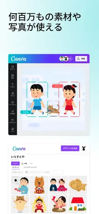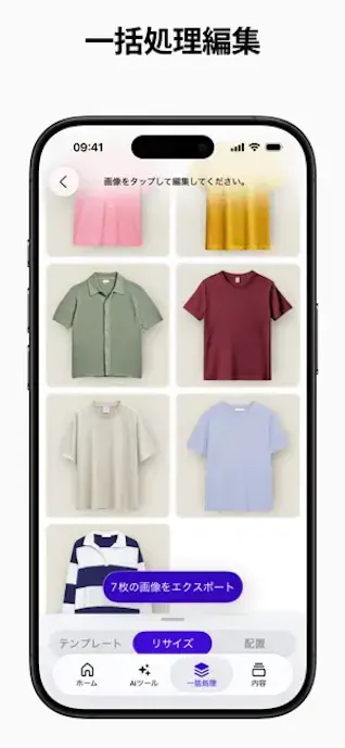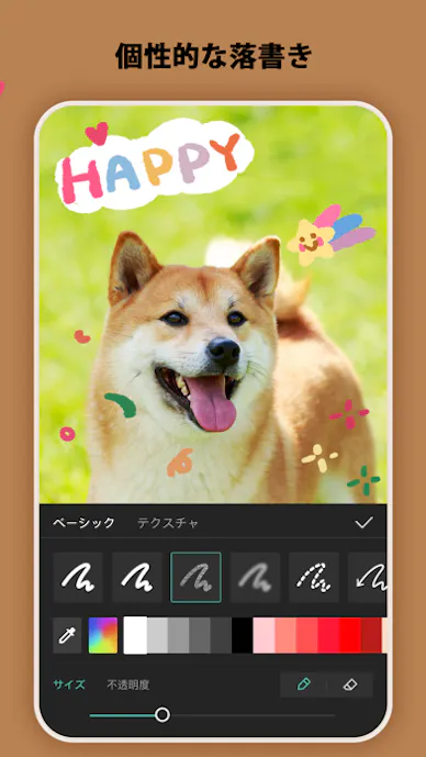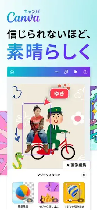 背景変更や文字入れまで一つのアプリ内で進めやすく、保存や共有もスムーズ。