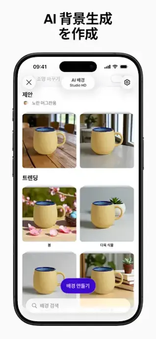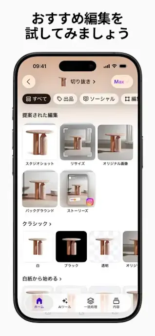 また、AIが背景削除を自動で行い、照明や細かい部分の自動補正も進められるので、難しい調整に慣れていなくても形にできます。
