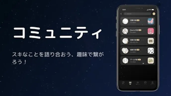 趣味のコミュニティには音楽や映画などの話題があり、自分で場を作ることも可能です。