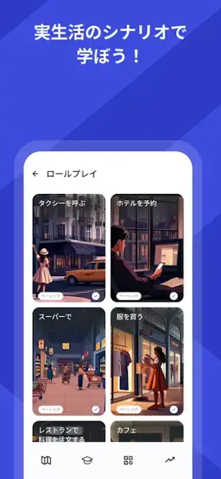 ダイアログでは日常表現を学べて、ロールプレイでは旅行や仕事、デートなど身近な場面を試せます。