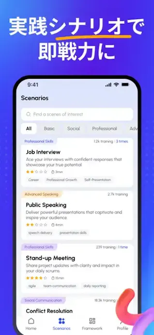 相手の本音を引き出す質問の型を、一人でじっくり身につけたい社会人におすすめの家で1人でもできる会話力トレーニング アプリです。