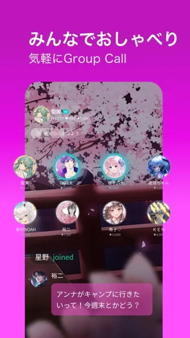 実際の会話は、配信に来た相手や最大8人のGroup Callで進みます。