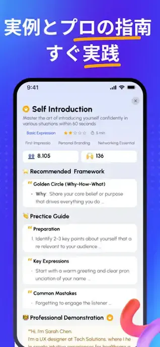 - 会話シーン別トレーニング:雑談/面接/自己紹介/ビジネスプレゼン