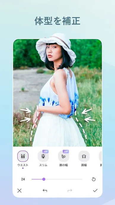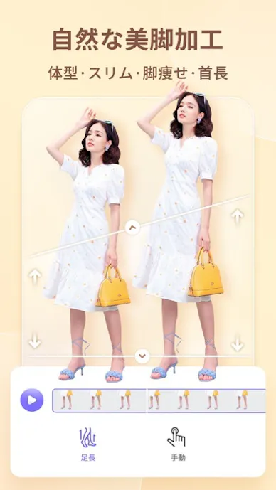 写真と動画の両方に対応していて、顔だけでなく体のラインまでまとめて調整できます。