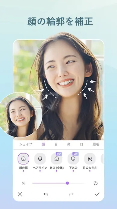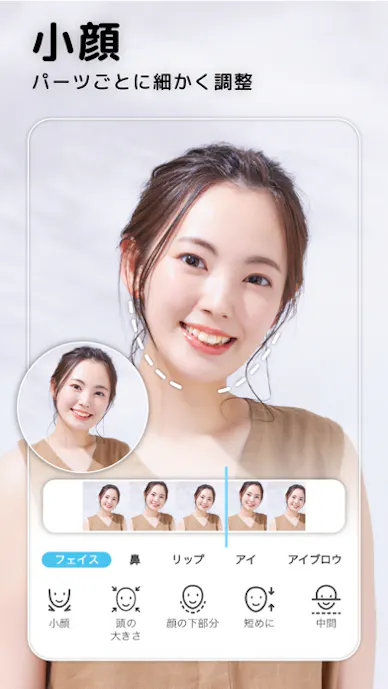 顔補正や美顔補正の微調整が30種類以上あり、小顔シェイプ、顎先調整、フェイスリフト、二重あご除去まで細かく対応できるのが魅力。