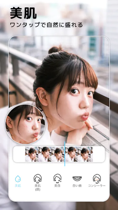 ワンタップで全体を整えた後に、必要な部分だけ顔加工をしたい人におすすめの無料美肌加工アプリです。