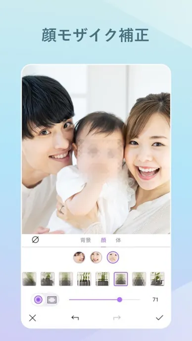 複数の顔をAIが認識するから、動いている場面でも違和感を抑えつつ顔補正してくれます。